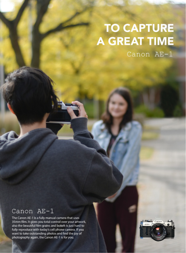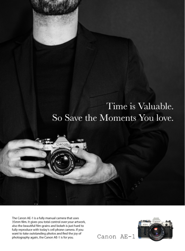 This project is a series of advertisement photographs I created in a photography class. The goal was to promote the Canon AE-1 film camera to three different target audiences: readers of Time, People, and Wired. I was interested in exploring how the same product could be communicated in different ways depending on the audience, and how visual style can shift the message while maintaining a consistent product identity.