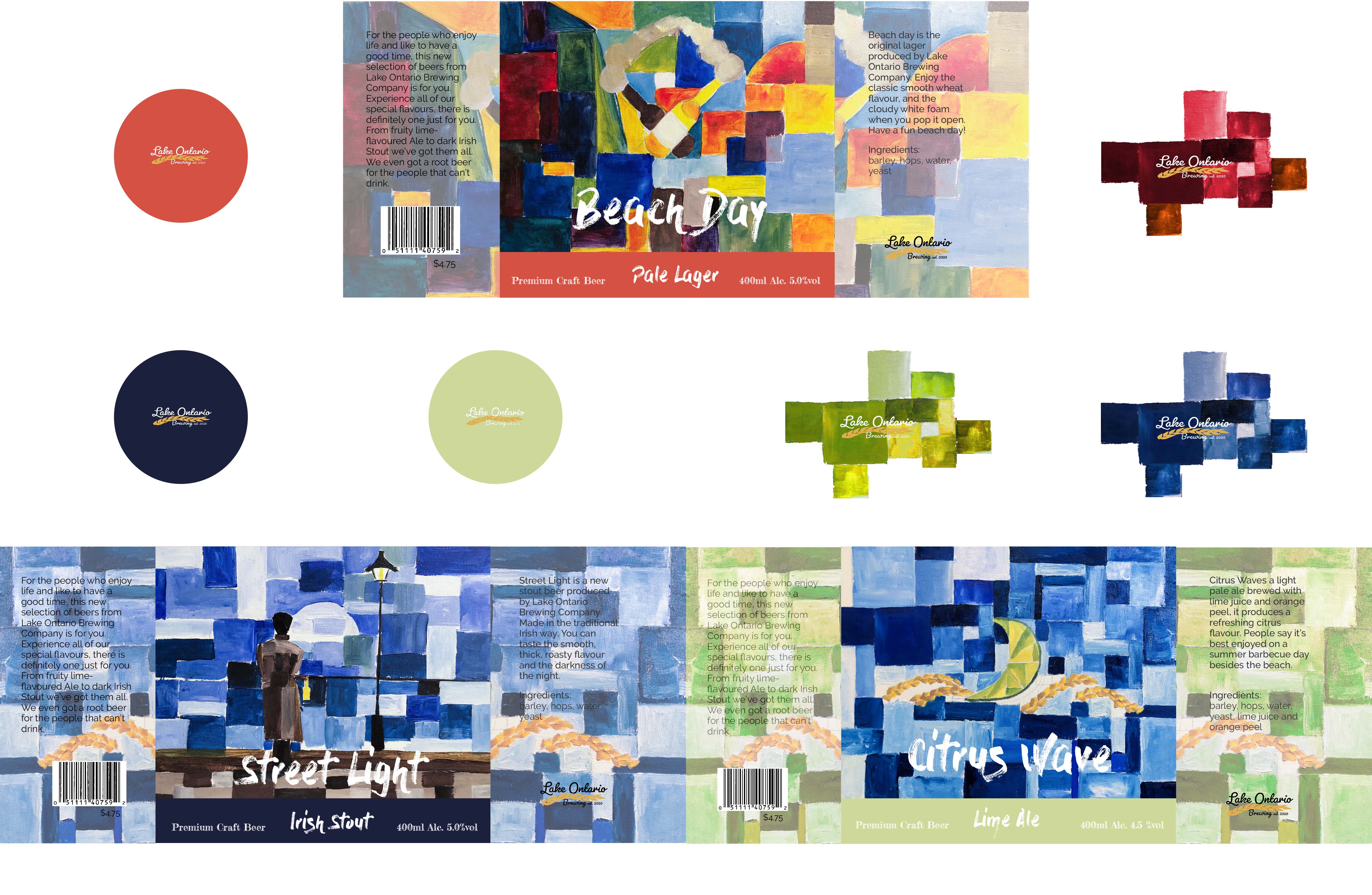 Lake Ontario Brewing is a conceptual beer brand I created as a packaging design project. Inspired by the bold and colourful bottle illustrations often seen in local liquor stores, I developed a series of visuals influenced by Delaunay and Picasso. Each design was intended to capture the character of a specific flavour while creating a strong and memorable shelf presence. I also designed a magazine advertisement to extend the visual identity beyond the packaging itself.