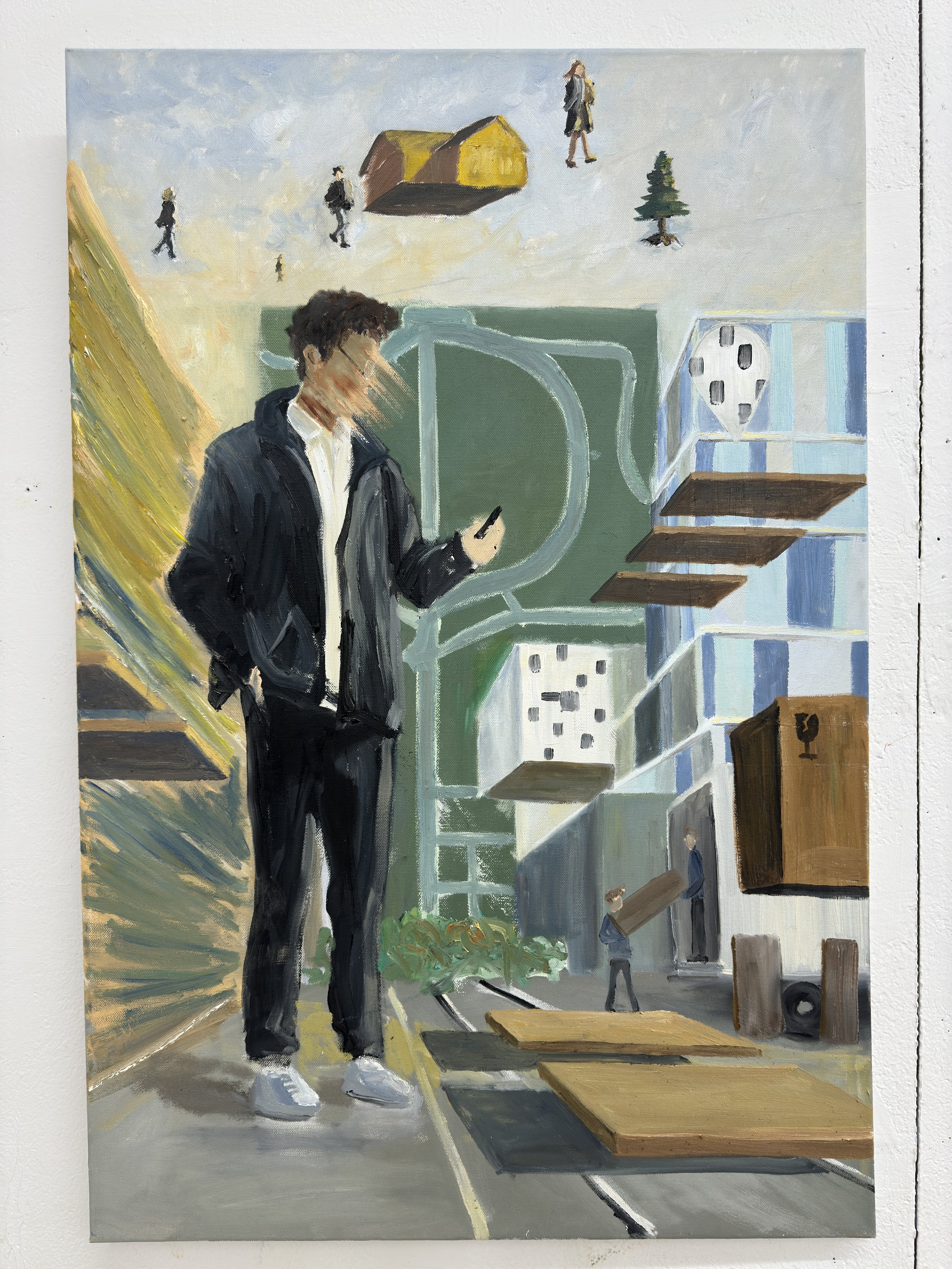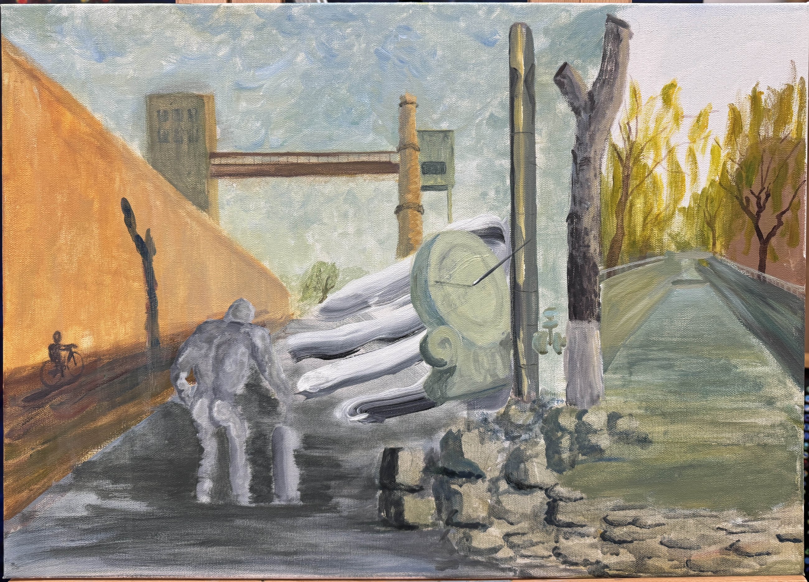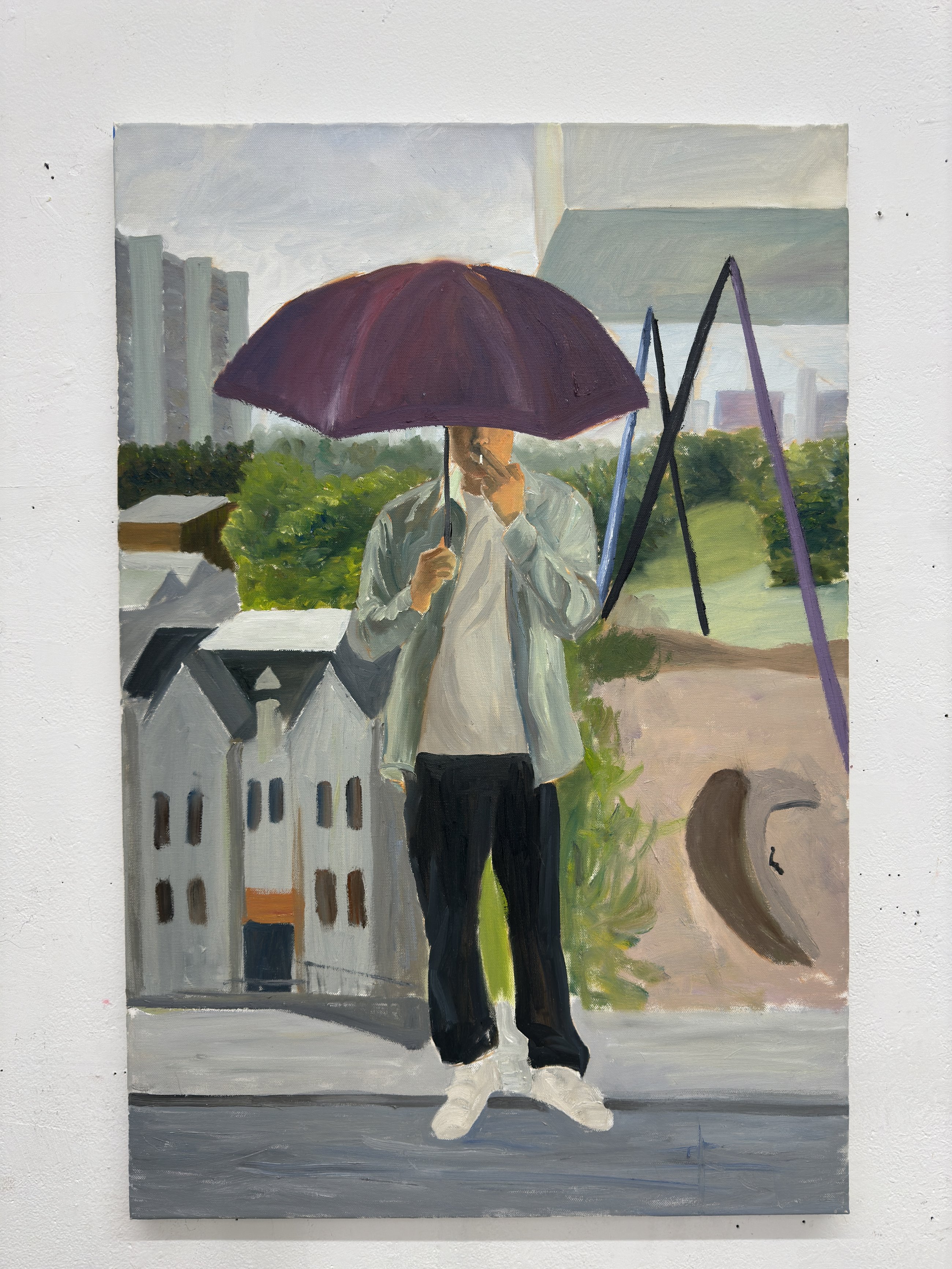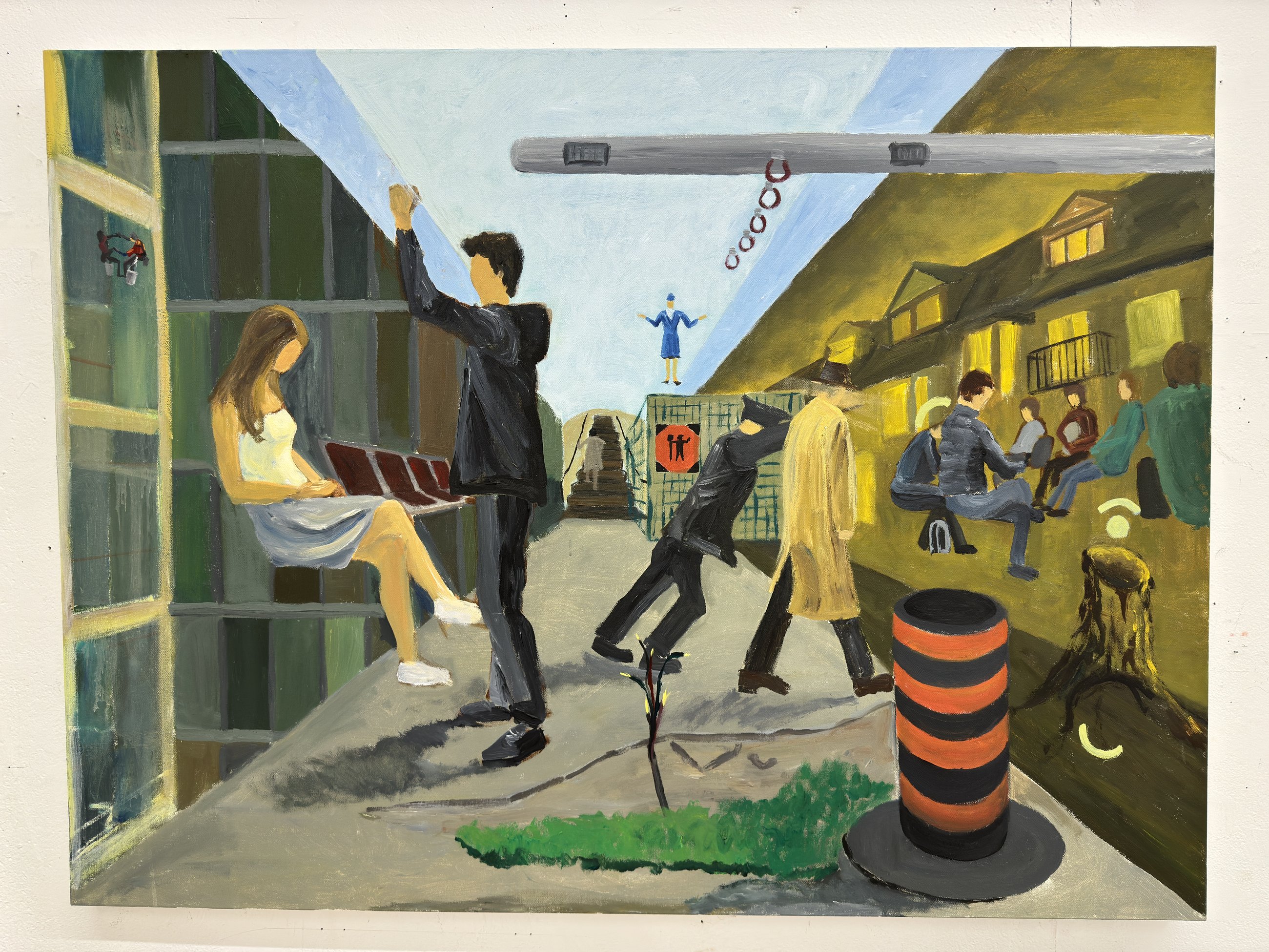 The street and city work grew out of walking around Toronto with a camera. I take photos, then work them up on canvas as composite scenes — a falling figure, a stranger under a purple umbrella, a street lined with exposed pipes and wires. Composing these pieces is the closest my painting practice gets to graphic storytelling: scale, hierarchy, and implied narrative all doing work together.