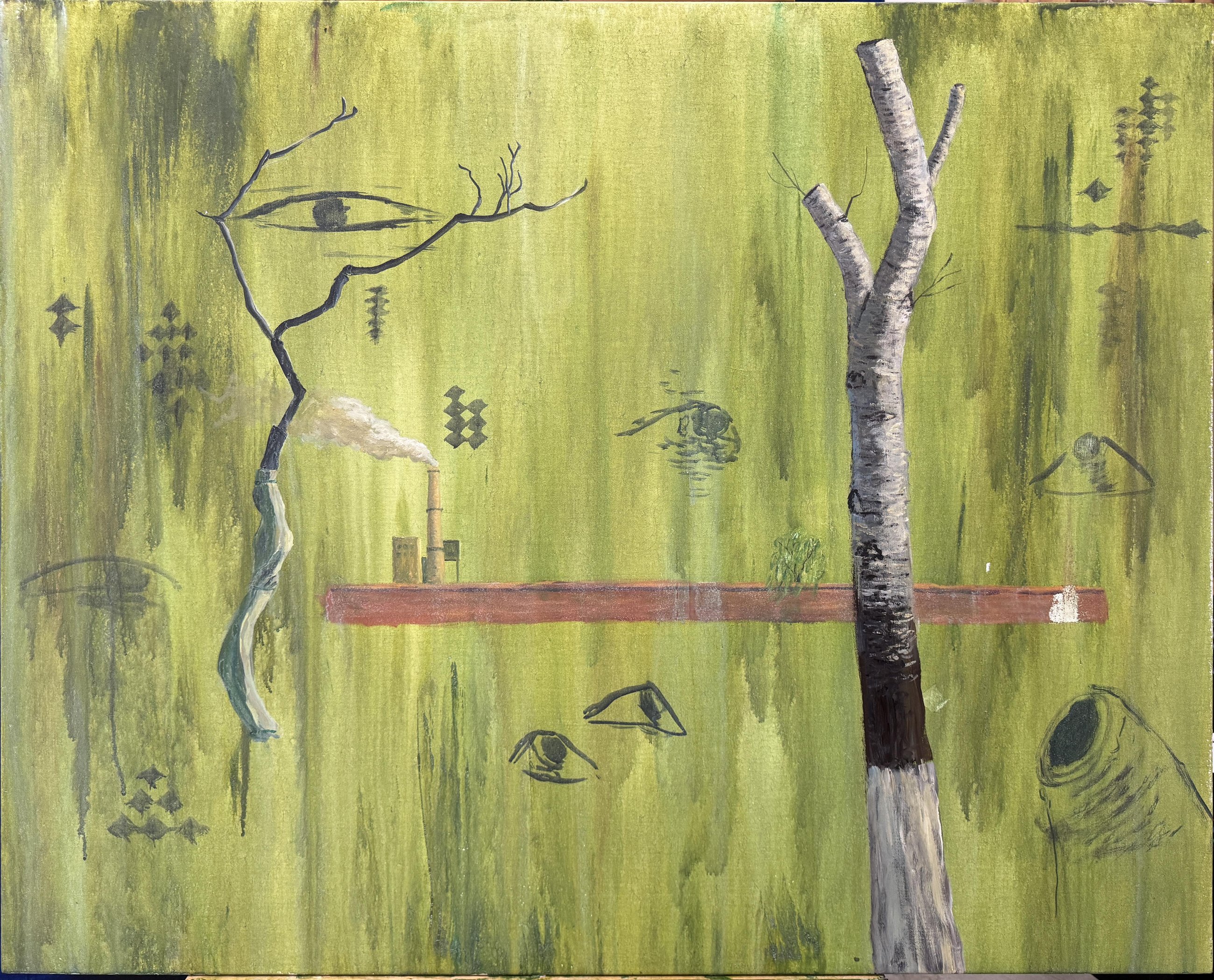 The symbolic and textured pieces (the green poplar canvas, the industrial landscape) are looser experiments in mark-making, layering, and mood. They're the ones where I give myself permission not to plan — to let the brush decide, and see what imagery surfaces.